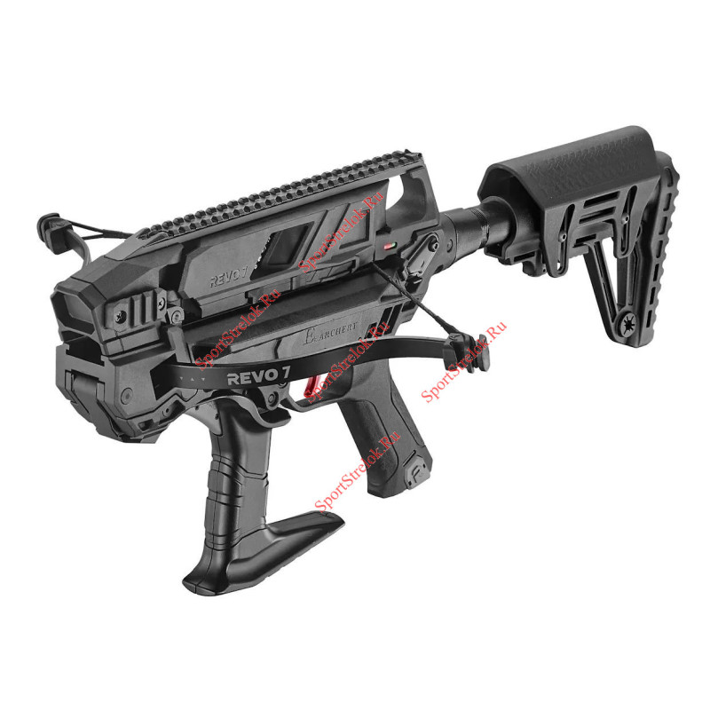 Если предыдущие модели серии обладали строгим дизайном с оглядкой на старую школу арбалетостроения, то Revo 7 – это арбалет, дизайн которого вдохновлен эстетикой современного автоматического оружия. Revo обладает компактными габаритами и отличной эргономикой. Арбалет комплектуется тактическим телескопическим прикладом на трубе com-spec с регулируемым подщечником и быстросъемным ременным креплением QD. По всей длине корпуса проходит прицельная планка picatinny на 25 слотов. Две дополнительные планки располагаются по бокам. Имеется специальный инструмента для снятия арбалета с боевого взвода, который аккуратно спрятан в рукоятке, а также специальное отверстия под установку замка, чтобы не допустить использование арбалетом ребенком или посторонним человеком.